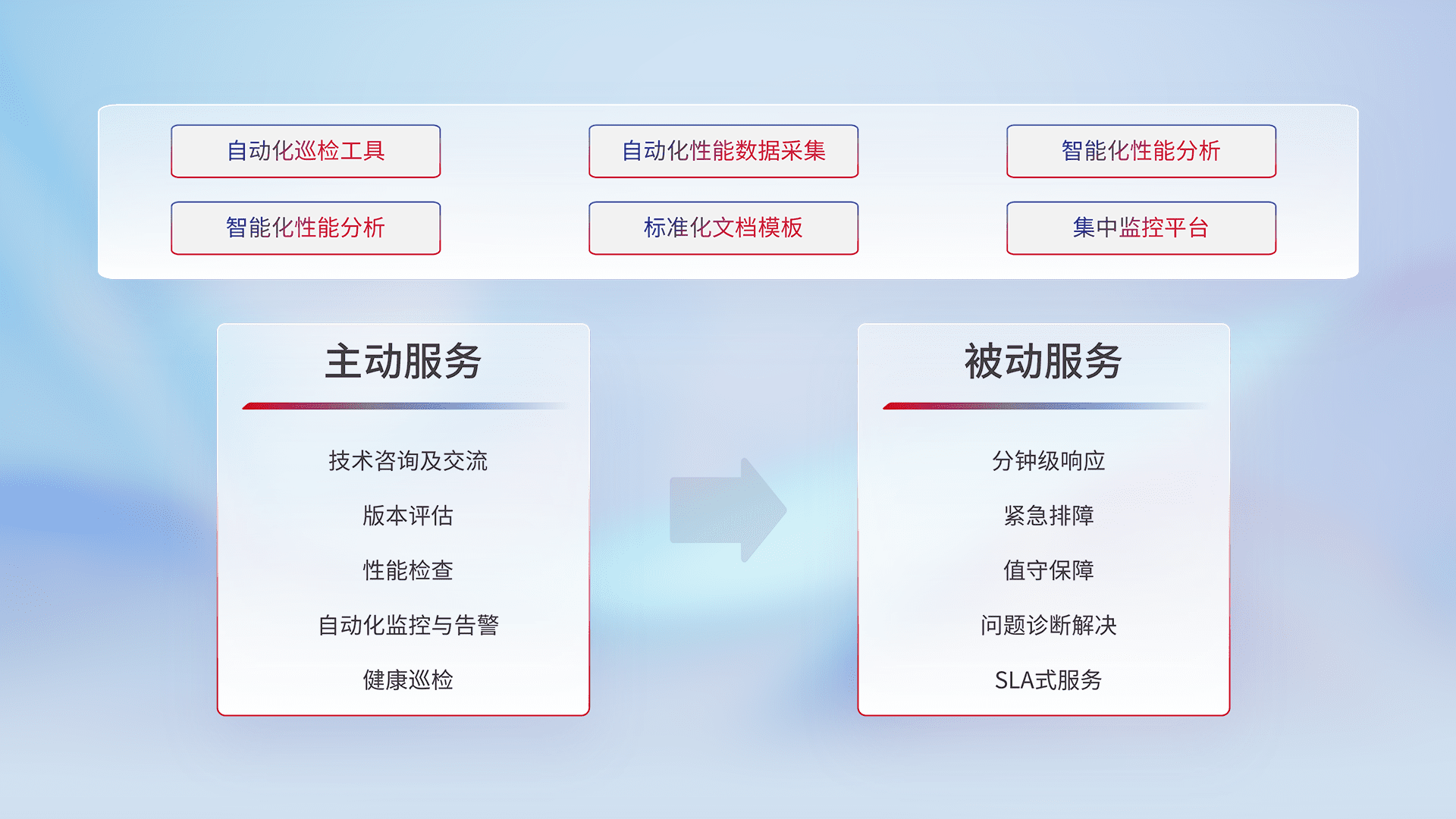 智能化工具和标准化文档,,保障服务质量,,,提供主动服务(包含技术咨询、、、版本评估、、、、性能检查、、、、自动化监控与告警、、、、健康巡检)和被动服务包含(分钟级响应、、、紧急排障、、值守保障、、、、问题诊断解决、、、SLA服务)。。。